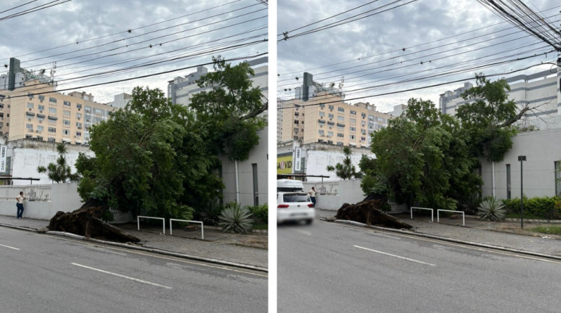 Nas imagens é possível ver que a árvore atinge um imóvel e uma parte do piso da calçada saiu do lugar