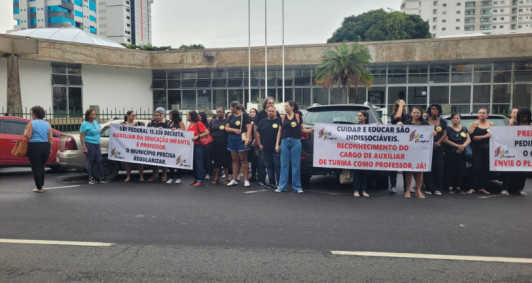O primeiro ato, que iniciou às 8h, teve o objetivo de mobilização pública para pressionar a prefeitura para realizar a implementação da Lei Federal 15.326/26, que é o reconhecimento dos Auxiliares de creche como profissionais do magistério.