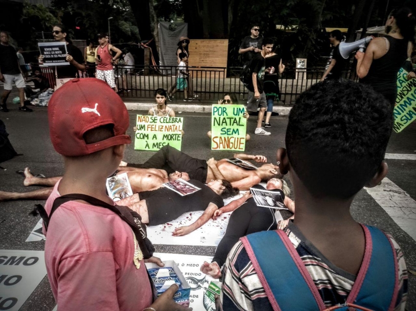 Na semana passada, São Paulo também foi palco para um ato da ONG Veddas, quando vários ativistas foram para as ruas segurando corpos de animais mortos. Esses animais usados no ato fazem parte do descarte das cruéis e gigantescas indústrias da carne, ovos e laticínios. Dezembro é o mês mais violento para os animais, por conta do avanço do extermínio animal para as festas de final de ano. E por isso São Paulo-SP também promoveu no último domingo, dia 16, no Vão Livre do MASP, a terceira edição do Natal Sem Sangue, um ato contra o holocausto animal, idealizado pelo movimento 269 Nordeste e articulado em Sampa pelo coletivo anti-especista Vozes em Luto SP.