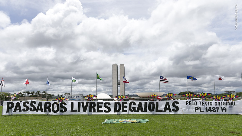 No último dia 10, por exemplo, houve manifestações de ativistas no Congresso Nacional, em Brasília, contra as mudanças feitas no texto do Projeto de Lei 1487/2019 (Nildo Tatto/PT-SP), que tramita na Câmara dos Deputados e que, em seu texto inicial, tinha como objetivo proibir por completo a criação de pássaros em gaiolas e cativeiros. Em outubro, a Comissão de Meio Ambiente e Desenvolvimento Sustentável, na Câmara, aprovou o texto substitutivo,apresentado pelo deputado Joaquim Passarinho (PSD-PA), que, ao invés de abolir por completo as gaiolas e cativeiros, regulamenta a criação e a comercialização de pássaros.